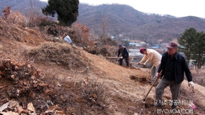 산소에 비석을 세우기 위해 땅을 고르는 모습